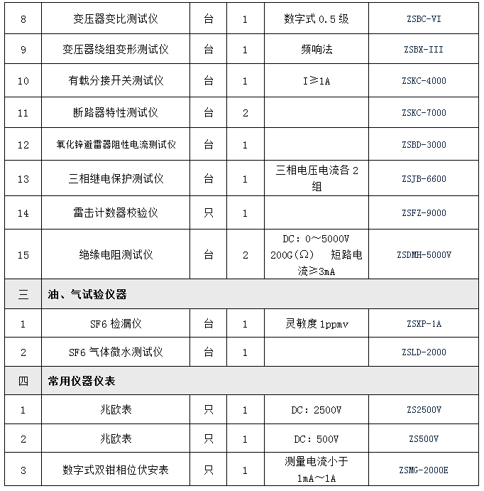 具有各专业试验室和可试验110千伏以下电压等级的输电、供电、受电电力设施的试验设备,即全套承试三级电力测试设备。