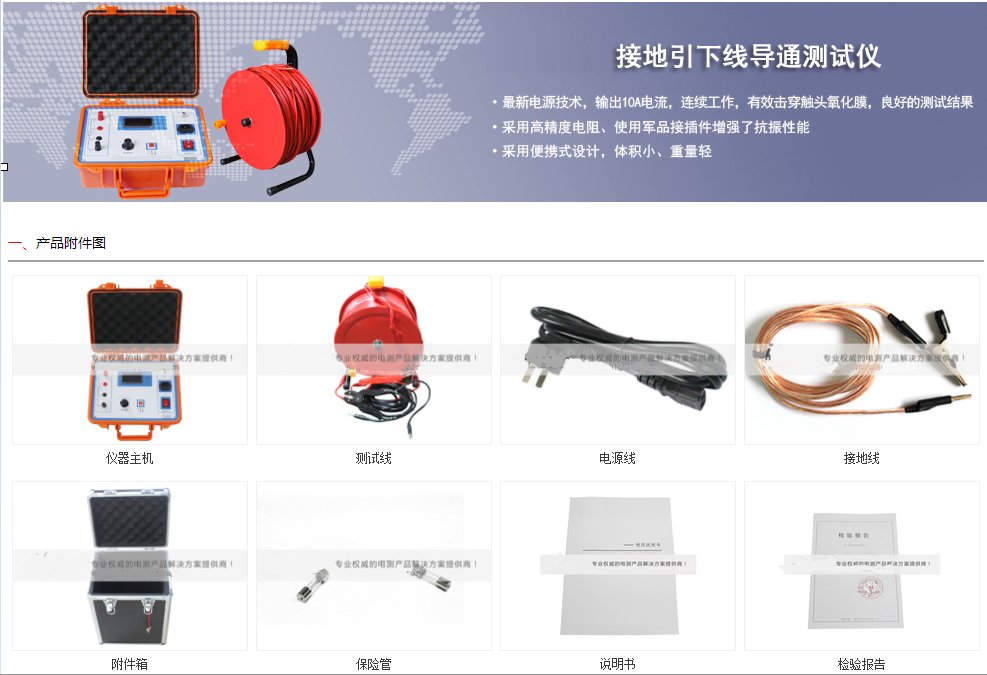 电力行业标准DL/T475-2006《接地装置特性参数测量导则》规定电气导通性应选用专门的仪器进行测量,仪器分辨率为1mΩ,准确度不低于1.0 级。我公司依据此标准研制的本仪器是一种自动化程度很高的便携式测试仪, 专门用于接地装置的电气完整性测试,其各项技术指标均达到或优于相关标准要求。仪器操作简单方便、精度高、测试速度快,复测性好、读数直观,是符合规程要求的理想的专用仪器,大大方便了试验项目的开展,提高了工作效率。