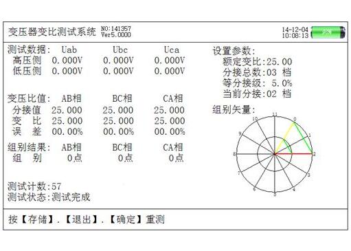 在参数设置屏中可见,需设置项目有:试品编号、额定变比、分接总数、等分接级、接线方式、设置日期、设置时间、界面风格。显示屏最下一行为提示行,提示操作人员如何进行操作,设置完毕后就按【退出】键返回;各项参数的含义和作用如下: