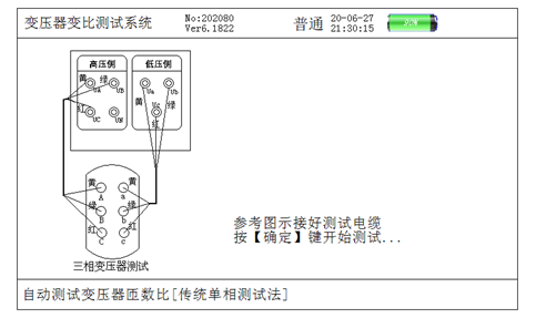 进行三相匝数比测试之前应先进行参数设置,按【设置】键或选择“参数设置”项按【↲】进入参数设置屏进行参数设置,设置好各参数后按【退出】键回到主界面选择“三相匝数比”测试选项按【↲】键进入如图七所示的接线提示屏,操作人员须按照图示进行接线。