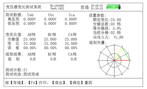 ZSBC-VI 变压器变比测试仪接线完成后按【↲】键开始自动进行测试,测试自动计数进行到42次自动停止计数,测试完毕,显示测试结果屏。提示行及测试结果屏如图八所示。测试完毕后结果显示在液晶屏上,图八中可见:屏幕左侧显示的测试数据结果,包括:三相高压侧电压值、三相低压侧电压值(以上两项为测试过程的数据),各相的当前分接变比值、三相实测额定变比值、三相变比误差百分数、判定组别,测试计数的次数及测试状态。右侧显示的为设置的各个参数。