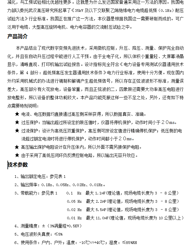 定为0.1Hz(推荐使用)、0.05Hz(推荐使用)、0.02Hz(升压过程较慢)、0.01Hz(升压过程很慢,10~40分钟,适合10公里以上电缆),说明书上所说的带载能力是理论值,现场时35KV电缆长度可达到3-15公里。