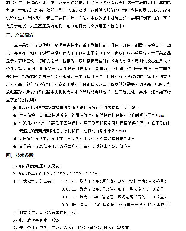 超低频高压发生器:超低频交流耐压试验装置是根据国家新行业试验标准而设计的试验设备,其安全可靠、功能强大、使用方便、维护简单。主要用于对各种电器产品、电气元件、绝缘材料、仪器仪表、办公设备等进行规定电压下的绝缘强度试验,以考核产品的绝缘水平