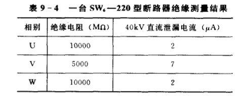 对于高压少油断路器,可以在三角箱加压、断口外侧接地来测量整个单元的泄漏电流。如有异常-再进一步分解是断口还是支持瓷套进水受潮。在绝大多数情况下,断路器进水受潮后,泄漏电流有明显变化,甚至远远超过标准(直流试验电压40kV下,1min的泄漏电流不大于10μA)。但在个别情况下,由于结冰或水分在局部沉积,泄漏电流反应不大灵敏。这要认真仔细研究与必要的检查。例如某变电站一台SW6—220型断路器1996年6月22日的绝缘测试结果见表9一4。由于未引起有关部门重视,未及时查找早期的绝缘缺陷或缩短试验周期,耽误了时间,于1997年4月5日,该断路器V相发生对地击穿爆炸事故。由此可知,泄漏电流测试结果虽符合标准规定,但相间差别很大或与历年相比有异常增长时,应进行分析,查明不正常原因,不可轻易放过。