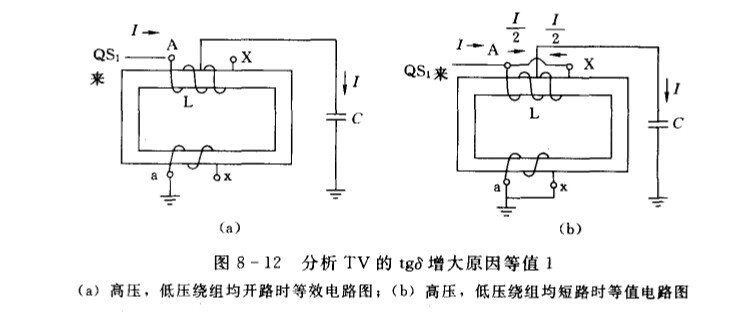 现场多用QS1型交流电桥进行测量,测量时应将TV的一次绕组短路(或开路),二次绕组必须短路接地,不能将一、二次绕组都开路,因为在高、低压绕组均开路时,流过介质的电容电流形成了绕组的电感与对地分布电容串联,使测得的tgδ增大了,这种现象可用图8—12(a)来说明,其中把高压绕组对地的分布电容及绕组的电感近似地用集中参数C与L来丧示。