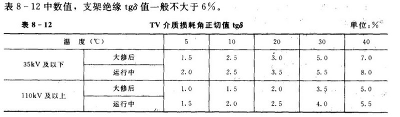 Q/CSG10007—2004规定:与历次试验结果相比,无明显变化;tgδ(%)不应大于表8—12中数值,支架绝缘tgδ值一般不大于6%。