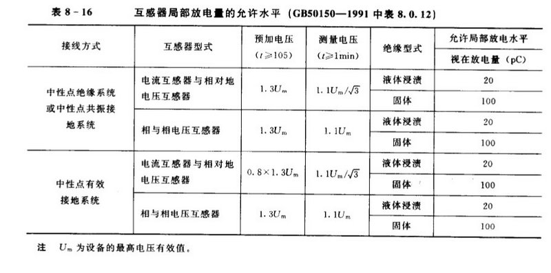 交接试验互感器局部放电水平见表8-16(GB50150-1991表2),预防性试验互感器局部放电量表见8-17(Q/CSG10007-2004局部放电试验)