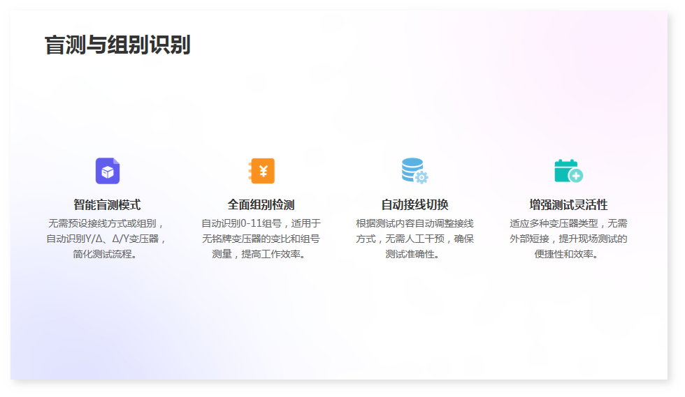 4·盲测功能:无需选择接线方式,无需选择接线组别,测量Y/△、△/Y变压器无需外部短接,可根据选择的测试内容自动切换接线方式。完全可以对没有铭牌的变压器进行变比和组号的测量。