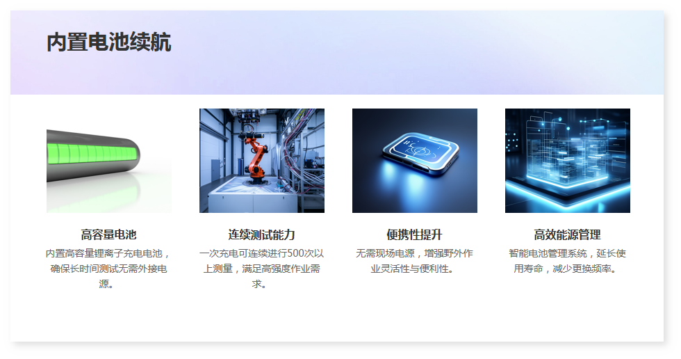 15·内部配备高容量锂离子充电电池,现场无需任何电源即可完成测试工作,一次充满可以连续进行1000次以上的测量。